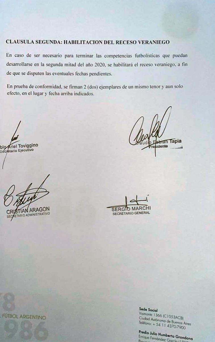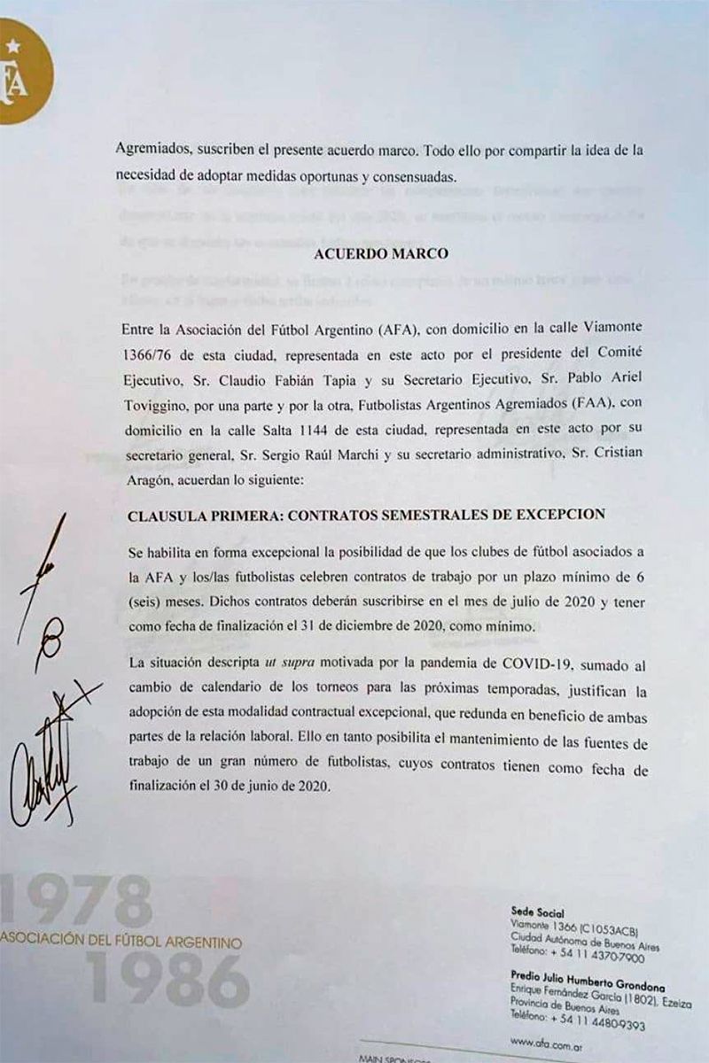 El acuerdo, que lleva la firma tanto de Claudio Tapia -presidente de AFA- como de Sergio Marchi -Secretario General de FAA- tiene como una de sus misiones principales "posibilitar el mantenimiento de las fuentes de trabajo de un gran número de futbolistas, cuyos contratos tienen como fecha de finalización el 30 de junio de 2020".