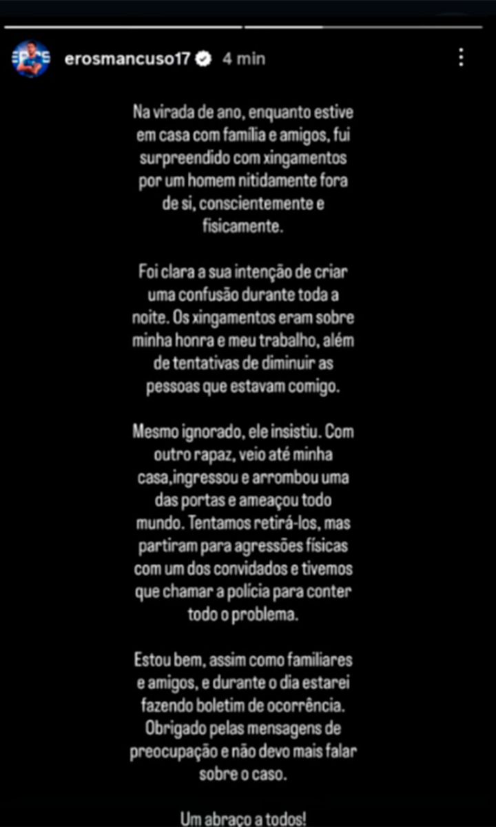 Finalmente, Mancuso aseguró que él y su entorno se encuentran en buen estado y confirmó que presentará una denuncia ante las autoridades brasileñas, al tiempo que agradeció los mensajes de apoyo y anticipó que no volverá a referirse públicamente al tema.