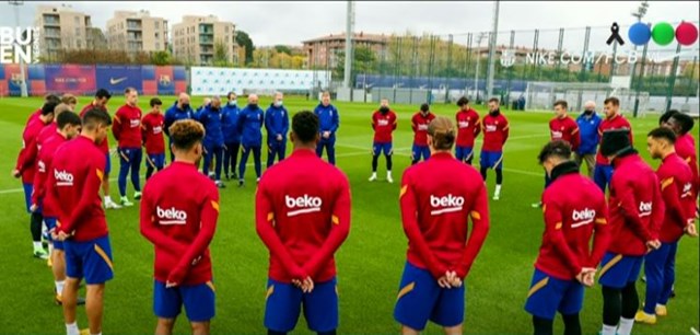 El homenaje del plantel al Barcelona se produjo en la reanudación de la actividad, aunque el club mantiene desde el miércoles las banderas a media asta en señal de luto por el deceso de Maradona.