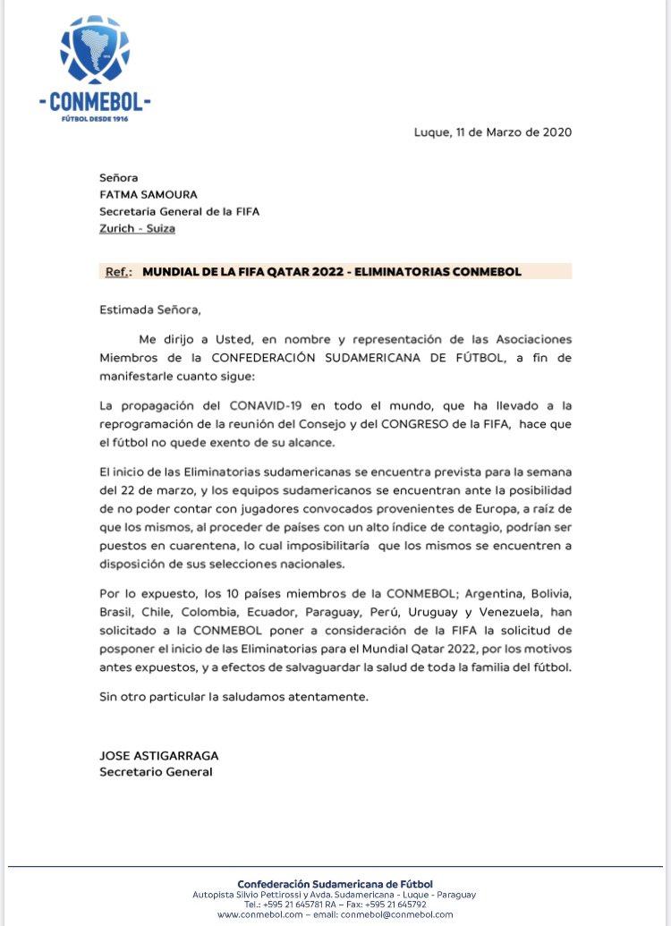 La Confederación Sudamericana de fútbol (Conmebol) solicitó esta noche a FIFA en forma oficial la suspensión de las eliminatorias sudamericanas que debían iniciarse a fines de marzo, con miras al Mundial Qatar 2022, a raíz de la expansión de la pandemia del Coronavirus.