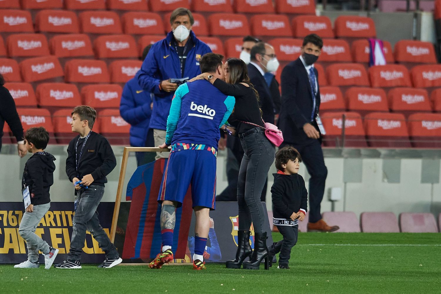 A minutos del silbatazo inicial, la dirigencia culé, encabezada por Joan Laporta, le entregó una camiseta enmarcada a la Pulga, que pudo disfrutar este reconocimiento junto a toda su familia. Su esposa Antonella y sus hijos Mateo, Ciro y Thiago estuvieron presentes en el Camp Nou.