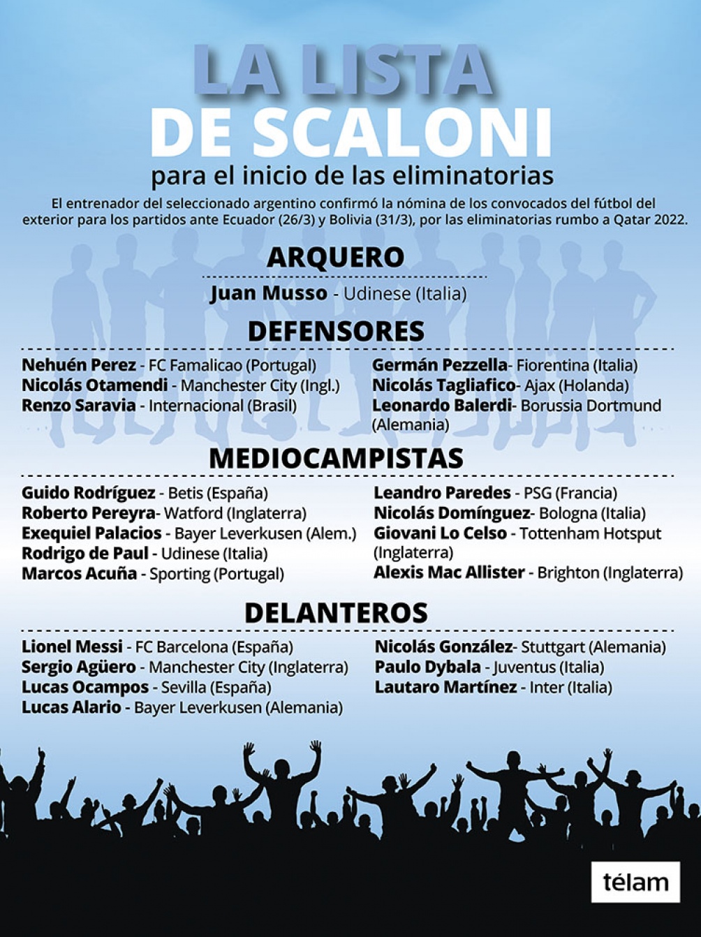 El primero en llegar a Buenos Aires será el que partió anoche desde Madrid con Leandro Paredes, Rodrigo De Paul, Juan Musso, Juan Foyth, Lautaro Martínez, Guido Rodríguez, Joaquín Correa, Lucas Alario, Exequiel Palacios, Emiliano Martínez, Nehuén Pérez, Nicolás Domínguez, Facundo Medina, Nicolás Tagliafico, Giovani Lo Celso, Alexis Mac Allister, Alejandro Gómez y Giovanni Simeone.