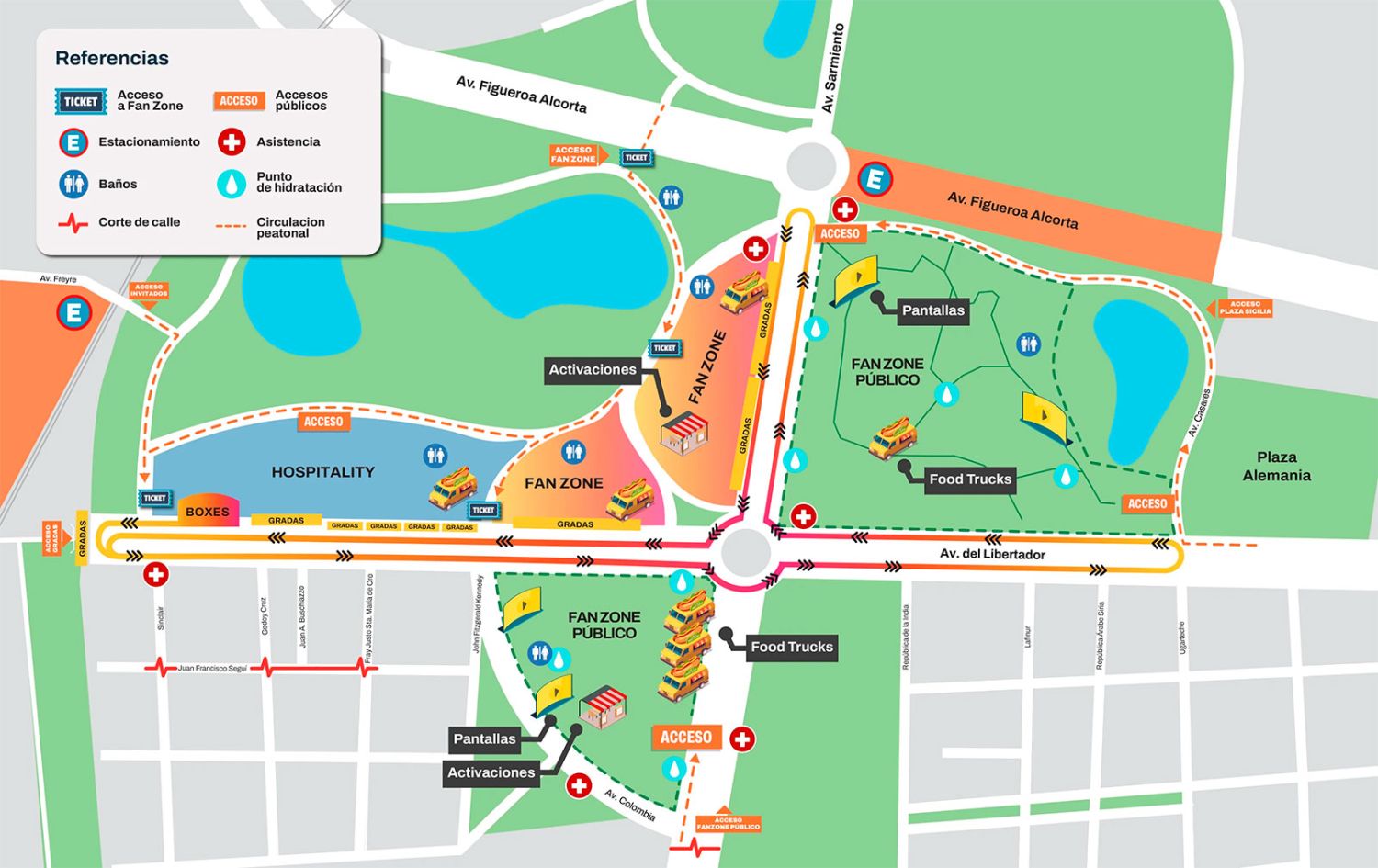 Las tribunas principales estarán ubicadas en la zona del Parque Tres de Febrero, con dos sectores de Fan Zone para quienes adquirieron entradas.