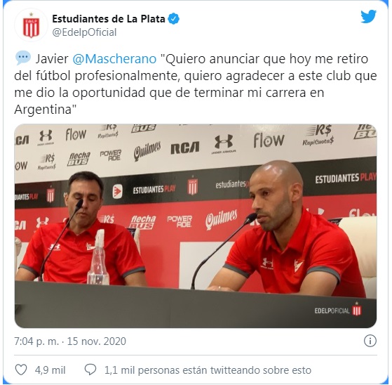 Hace algunos días fue Fernando Gago el que comunicó que ya no seguirá desempeñándose como futbolista profesional. Mientras que este domingo por la tarde, Javier Mascherano anunció que tomó la misma decisión que su colega, la noticia se dio a conocer por el mismo futbolista, en la conferencia de prensa que brindó después de la derrota de Estudiantes ante Argentinos Juniors por 1-0.