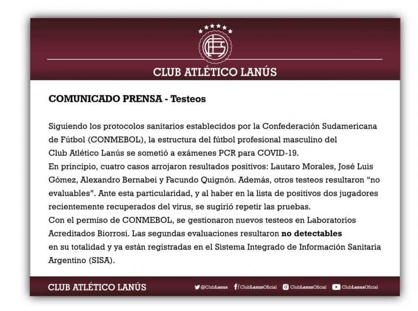 ¿Que pasó? En Lanús llamó la atención dos cuestiones claves en todo esto. Primero, que los cuatro jugadores se encontraban en perfecto estado de salud y sin ningún tipo de síntoma. Pero además, tanto Morales como Bernabei ya habían tenido el virus y en su momento si sintieron distintos síntomas. Eso hizo ruido y, tras el visto bueno de la Conmebol, realizó nuevos testeos que terminaron sacando a la luz la verdad: ninguno de los cuatro se había contagiado. Un alivio para el Granate.