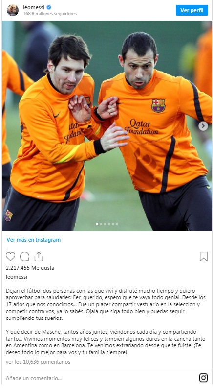 Hoy, Lionel Messi, compañero de ambos en la Selección y de Mascherano en el Barcelona, les dedicó unas emotivas palabras en su cuenta de Instagram.