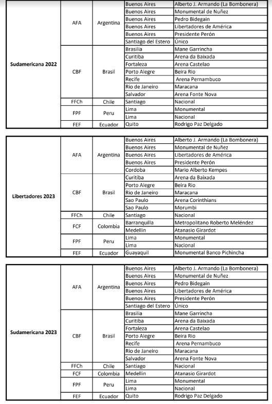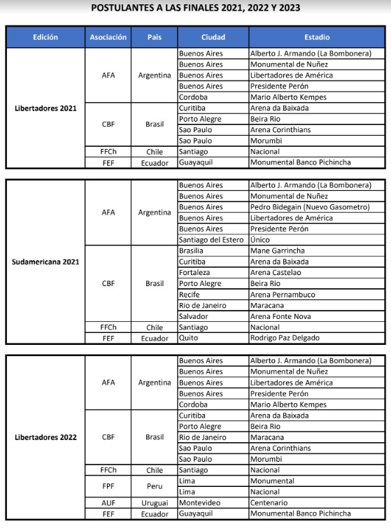 En medio del parate por la pandemia de coronavirus, la Conmebol oficializó este jueves las ciudades y estadios postulantes para las Copas Libertadores y Sudamericana para los próximos tres años.