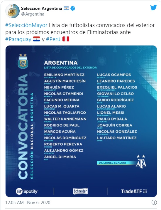 La Selección Argentina oficializó la lista de futbolistas que se desempeñan en el exterior que estarán en la próxima doble fecha de Eliminatorias Sudamericanas para el Mundial Qatar 2022.