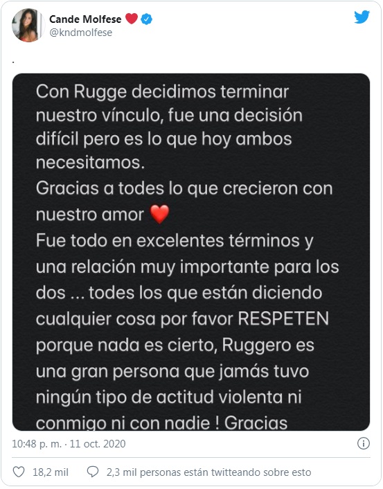 "Con Rugge decidimos terminar nuestro vínculo, fue una decisión difícil pero es lo que hoy ambos necesitamos. Gracias a todes los que crecieron nuestro amor", comienza el comunicado publicado en Twitter.