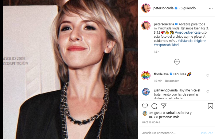 Posteó una foto que la muestra sonriente, de hace algunos años atrás: "Abrazos para toda mi hinchada linda. Estamos bien los 3. Me quedo en casa y uso esta foto de archivo porque quiero. A cuidarnos ma?s. #distancia #higiene #responsabilidad", escribió.