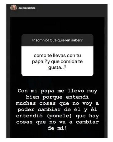 En Instagram, la actriz contestó preguntas de sus seguidores y fue sincera. Primero, aseguró que mantiene un diálogo con Diego. Y luego amplió. "Con mi papá me llevo muy bien porque entendí muchas cosas que no voy a poder cambiar de él y él entendió (ponele) que hay cosas que no va a cambiar de mí", escribió.