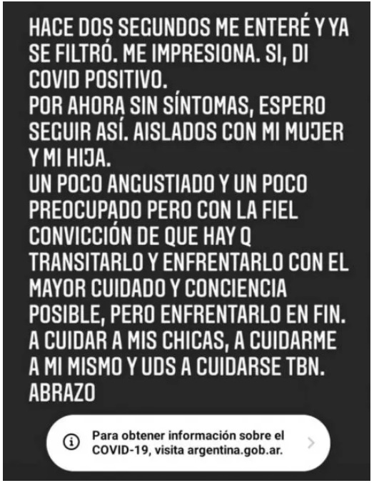 "Estoy un poco angustiado y un poco preocupado pero con la fiel convicción de que hay que transitarlo y enfrentarlo con el mayor cuidado y conciencia posible, pero enfrentarlo en fin. A cuidar a mis chicas, a cuidarme a mí mismo y ustedes a cuidarse también. Abrazo", contó en una publicación de Instagram luego de trascendiera en las redes su infección.