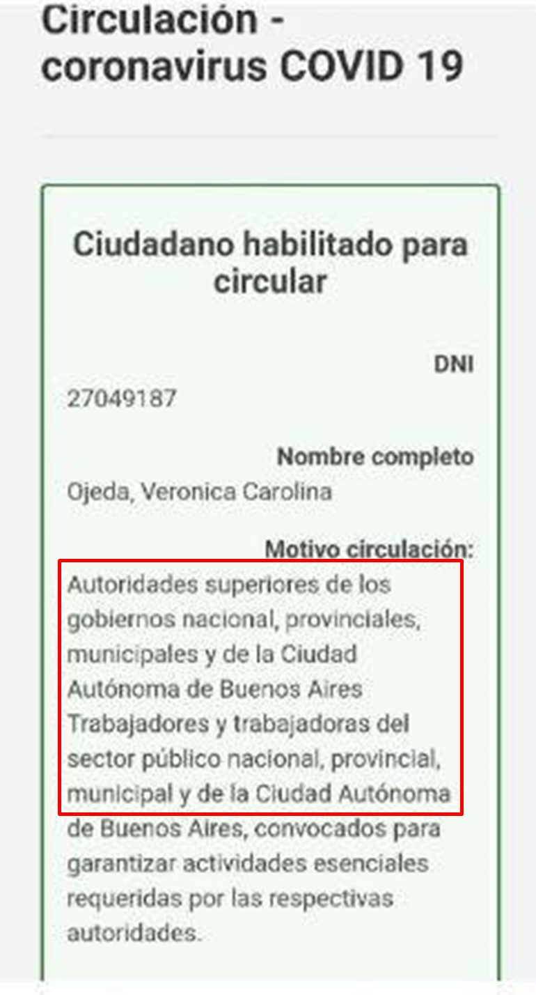 Al parecer, la ex del Diez mostró su pase a través de la app Cuidar y allí estaba registrada como "funcionaria pública". Además, habría explicado que quería trasladarse desde su casa en Ezeiza a una quinta en Loma Verde.