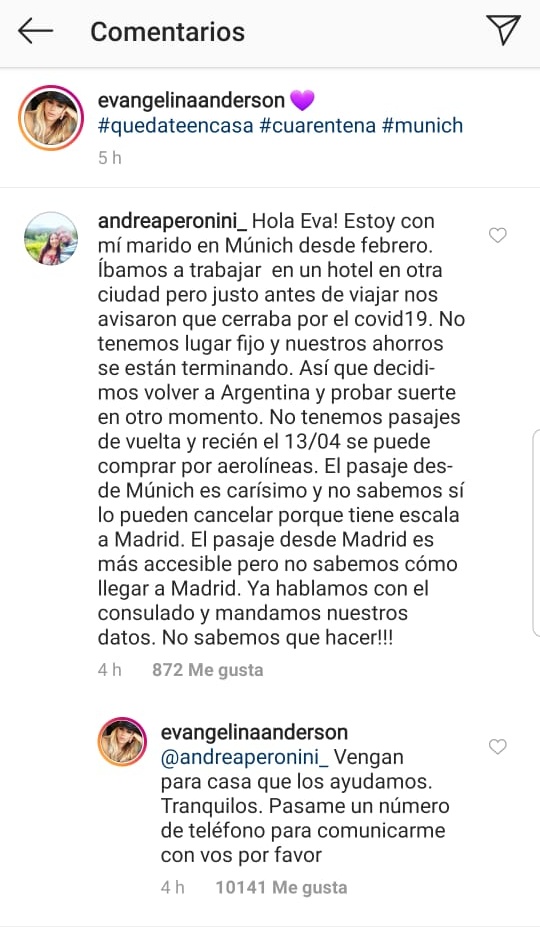 En un posteo realizado este viernes por la modelo en su cuenta de Instagram, una mujer llamada Andrea Peronini le escribió: “Hola Eva. Estoy con mi marido en Munich desde febrero. íbamos a trabajar en un hotel en otra ciudad pero justo antes de viajar nos avisaron que cerraba por el covid19. No tenemos lugar fijo y nuestros ahorros se están terminando. Así que decidimos volver a Argentina y probar suerte en otro momento. No tenemos pasajes de vuelta y recién el 13/04 se puede comprar por Aerolíneas. El pasaje desde Munich es carísimo y no sabemos si lo pueden cancelar porque tiene escala a Madrid. El pasaje desde Madrid es más accesible pero no sabemos cómo llegar a Madrid. Ya hablamos con el consulado y mandamos nuestros datos. No sabemos qué hacer!!!”.