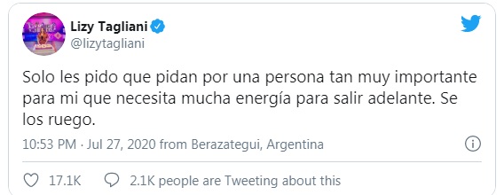 Minutos antes de las 22 horas, Lizy Tagliani había emitido un misterioso mensaje por Twitter, pidiendo por un ser querido.