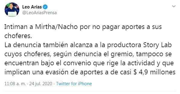 Por su parte, el periodista, Leo Arias anunció dicha información a través de su cuenta en Twitter donde escribió: "Intiman a Mirtha/Nacho por no pagar aportes a sus choferes. La denuncia también alcanza a la productora Story Lab cuyos choferes, según denuncia el gremio, tampoco se encuentran bajo el convenio que rige la actividad y que implican una evasión de aportes a de casi $ 4,9 millones".