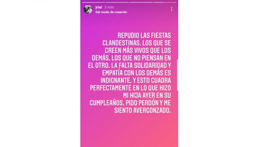 “Repudio las fiestas clandestinas”, comenzó el descargo en la storie del exconductor de Intrusos en el espectáculo (América TV), y continuó: “Los que se creen más vivos que los demás. Los que no piensan en el otro. La falta de solidaridad y empatía con los demás es indignante. Y esto cuadra perfectamente en lo que hizo mi hija ayer en su cumpleaños”.