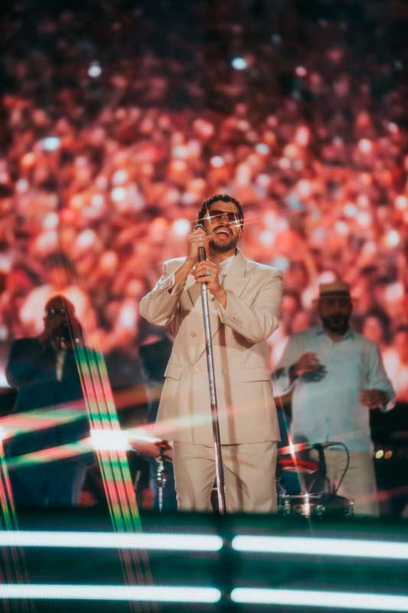 Por cuestiones climáticas, se esperaba una tormenta pasada la medianoche, se decidió adelantar el show y finalmente Benito, coreado por las miles de personas con su nombre de pila y no como Bad Bunny, hace su gran aparición. De traje crema, lentes y acompañado por Los Sobrinos, la banda que lo acompaña en el homenaje a su isla y sus ritmos, llega en modo frontman para iniciar con “La mudanza”, la canción donde cuenta cómo su padre y su madre se conocieron y por qué Los Ángeles o Nueva York nunca podrían ser su hogar. “De aquí nadie me saca/ de aquí yo no me muevo/ Dile que esta es mi casa/ donde nació mi abuelo”, canta y es imposible no moverse.