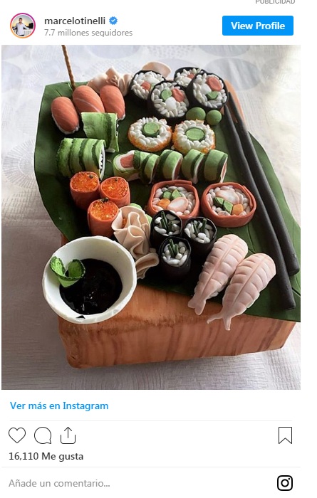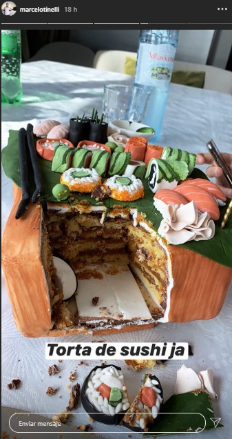 Para homenajearla, encargaron una tabla de sushi bien completa, con todas las piezas que la cumpleañera ama. Pero la 'vedette' de la noche fue la mega torta temática que crearon exclusivamente para ella. La misma estaba decorada justamente como la tabla que se acababan de comer y tenía un relleno bien clásico, de bizcochuelo de vainilla con dulce de leche que todos devoraron.