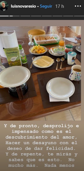 Además, el periodista puso en sus stories una foto del desayuno que le hizo a su pareja. "Y de pronto, desprolijo e impensado como el descubrimiento del amor. Hacer un desayuno con el deseo de dar felicidad. Y de repente, te mirás y sabes que es esto. No mucho más. Nada menos", escribió.