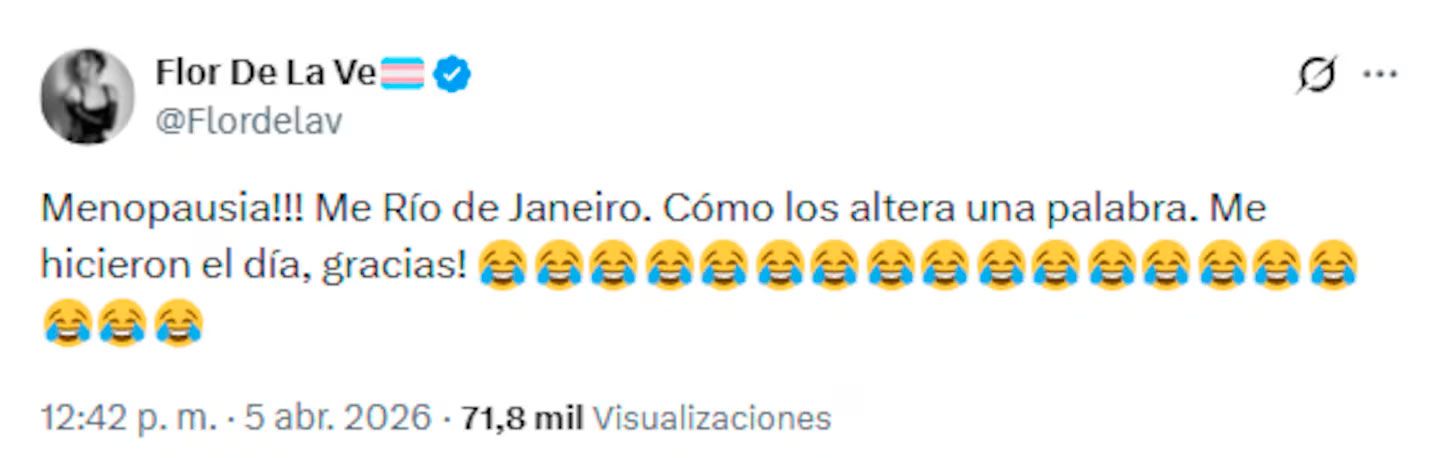 Fiel a su estilo, ella no los pasó por alto y retrucó en su perfil de la red social X: “¡Menopausia! Me Río de Janeiro. Cómo los altera una palabra. Me hicieron el día, gracias!”.