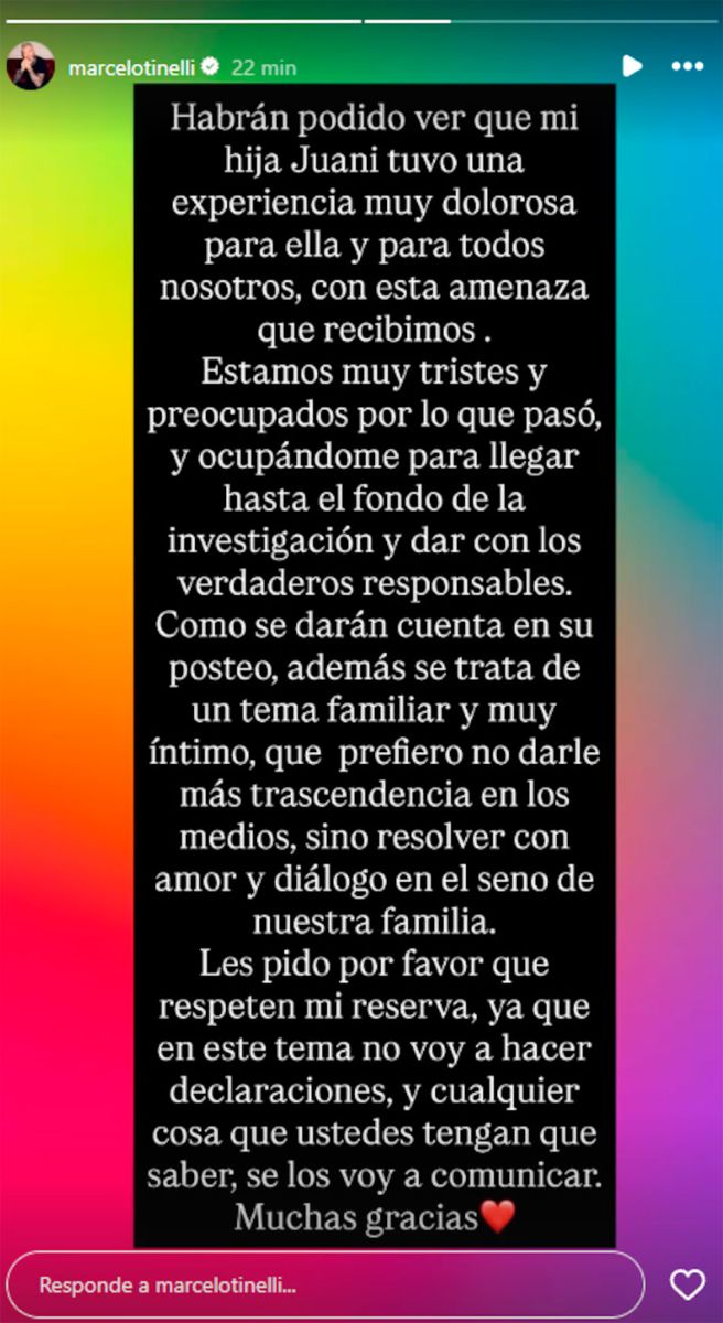 Juana Tinelli fue amenazada de muerte y publicó un comunicado en el que responsabilizó a su papá, Marcelo, por los llamados que recibió. Ahora, el conductor subió un mensaje a su cuenta de Instagram en el que dio su versión.