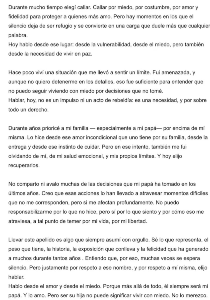 Llevar este apellido es algo que siempre asumí con orgullo. Sé lo que representa, el peso que tiene, la historia, la exposición que conlleva y la felicidad que ha generado a muchos durante tantos años. Entiendo que, por eso, muchas veces se espera silencio. Pero justamente por respeto a ese nombre, y por respeto a mí misma, elijo hablar. Hablo desde el amor y desde el miedo. Porque más allá de todo, él siempre será mi papá. Y lo amo. Pero ser su hija no puede significar vivir con miedo. No lo merezco.
