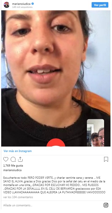 Mariano pudo hacer una videollamada con su hija, fruto de su primer matrimonio, y a través de Instagram compartió su felicidad por verla en buen estado de salud: “Escucharte es todo, pero poder verte… y charlar, sentirte sana y serena me sanó el alma”, enfatizó el animador de Polémica en el bar, sensibilizado. “Gracias a Dios, gracias Dios por la señal del celu en el medio de la montaña en una islita”, contó.