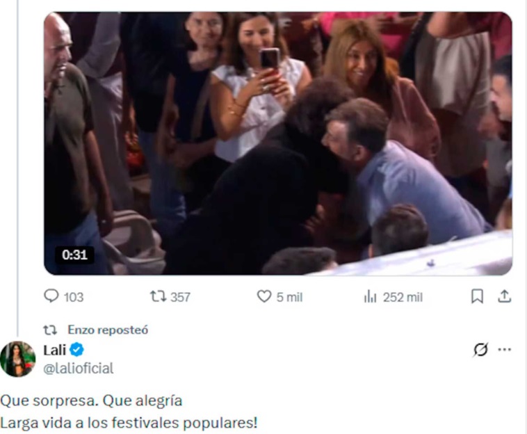 Los dardos y cruces entre Lali Espósito y el presidente Javier Milei sumaron un nuevo capítulo en las últimas horas. Tras el paso del Presidente por el Festival Jesús María, donde se subió en la madrugada del sábado al escenario para cantar con el Chaqueño Palavecino, la cantante ironizó con un mensaje en redes sociales. “Qué alegría”, escribió en su cuenta de X.