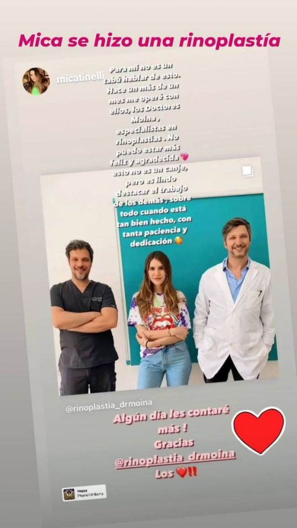 "Para mí no es un tabú hablar de esto. Hace más de un mes me operé con ellos, los doctores Moina, especialistas en rinoplastías", dijo junto a una foto de los médicos que trabajaron en su nariz. "No puedo estar más feliz y agradecida. Esto no es un canje, pero es lindo destacar el trabajo de los demás, sobre todo cuando está tan bien hecho, con tanta paciencia y dedicación", dijo la joven feliz con los resultados.
