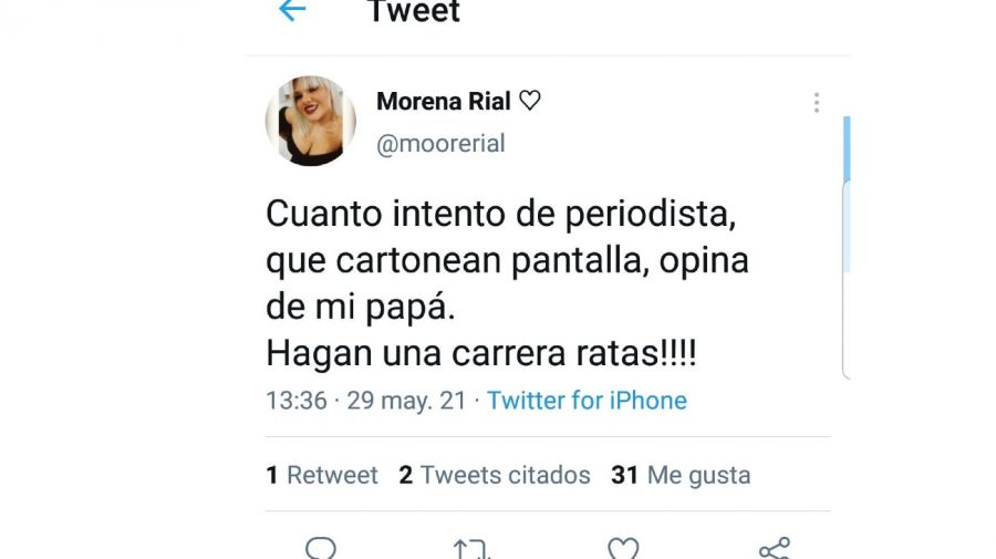 No solo la actriz y cantante usó su cuenta de Instagram para “bancar” a su papá, sino también que se manifestó a través de la red social del pajarito: “Cuánto intento de periodista, que cartonean pantalla, opina de mi papá. ¡Hagan una carrera, ratas!”.