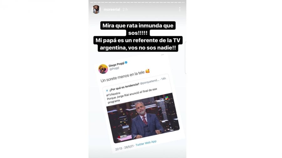 La cantante no tardó en responderle al periodista a través de una historia de Instagram contundente. “¡Mirá qué rata inmunda que sos! Mi papá es un referente de la TV argentina, vos no sos nadie”, lanzó furiosa Morena contra Poggi.