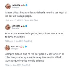Nati Jota indicó por qué no se sorprendió al descubrir los tuits que escribió hace 10 años. “En cualquiera de las notas que he hecho sobre mi carrera pueden ver que cuando yo arranqué en Twitter tenía 15 años y la moda era (usar) humor negro, que hoy en día no es soportable y súper cuestionable. No digo que antes no -aclaró-. Y yo quería sumar seguidores, me divertía. Y entré en esa”, explicó y agregó que, por aquel entonces, incluso, había bloqueado a sus conocidos para que no pudieran ver el contenido de lo que publicaba.
