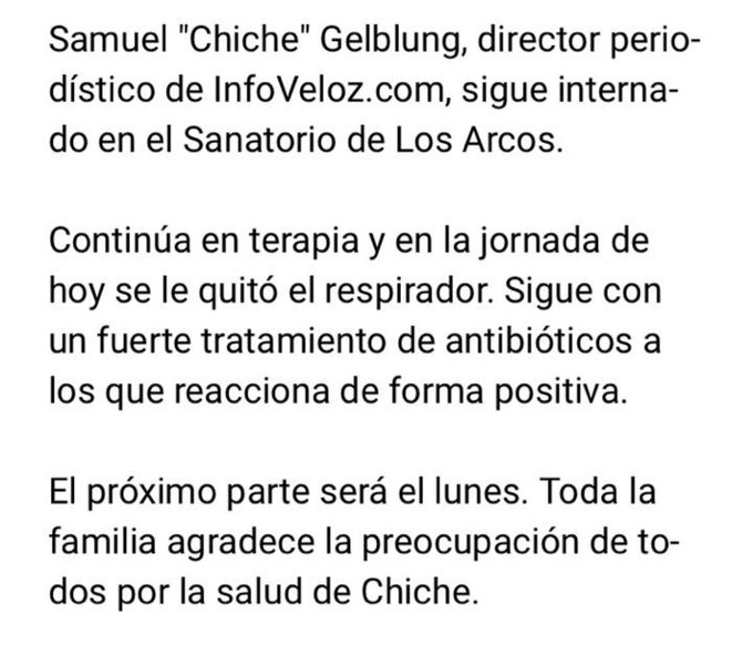 Este sábado el Sanatorio Los Arcos dio un nuevo parte médico en el que actualizó cómo está la salud del periodista: "Continúa en terapia y se le quitó el respirador. Sigue con un fuerte tratamiento de antibióticos a los que reacciona de forma positiva".
