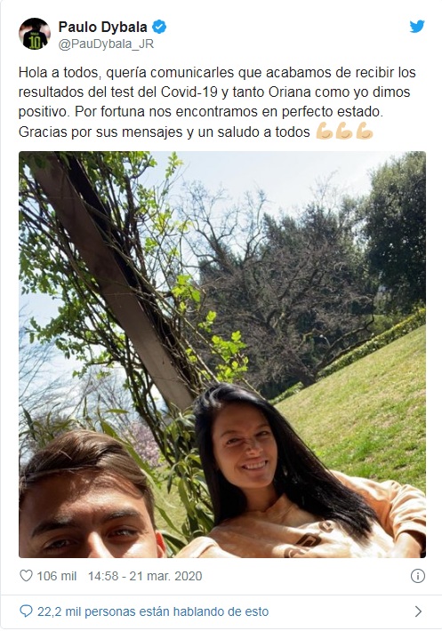 "Hola a todos, quería comunicarles que acabamos de recibir los resultados del test del Covid-19 y tanto Oriana como yo dimos positivo. Por fortuna nos encontramos en perfecto estado. Gracias por sus mensajes y un saludo a todos", indicó Dybala.
