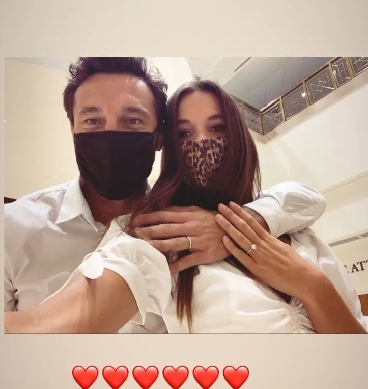 El ex de Pampita subió la fotografía en sus historias de Instagram donde posaron felices y con barbijo como medida preventiva en el marco de la pandemia de coronavirus. Para completar su posteo etiquetó a la joven y sumó emojis de corazones rojos.