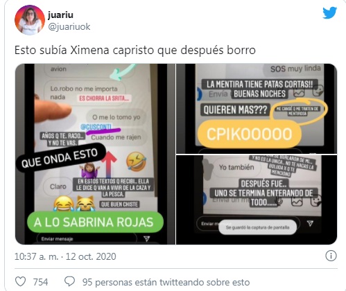 Juariu, la 'investigadora de famosos' en redes sociales, hizo varias capturas de esas publicaciones y la definió como 'la nueva Sabrina Rojas', haciendo alusión al jaqueo que la actriz sufrió hace un tiempo.