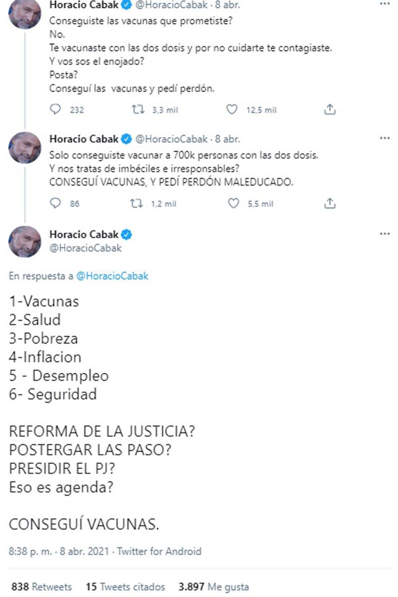 Respecto a los efectos de la segunda ola de coronavirus, la situación sanitaria de la Argentina y el caso de las vacunas contra el covid-19 el pasado jueves Cabak interrumpió su seguidilla de “pulgares arriba” para hacer un duro descargo contra el presidente Alberto Fernández, en una serie de tres tweets.