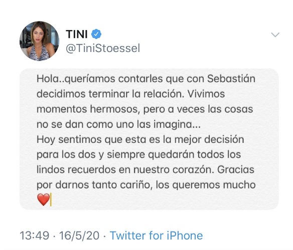 Tras diversos rumores sobre la separación de los jóvenes artistas, este sábado llegó la confirmación. La cantante argentina fue la encargada de comunicar. “Hola..queríamos contarles que con Sebastián decidimos terminar la relación”, escribió en su cuenta oficial de twitter Tini y agregó: “Vivimos momentos hermosos, pero a veces las cosas no se dan como uno las imagina”.