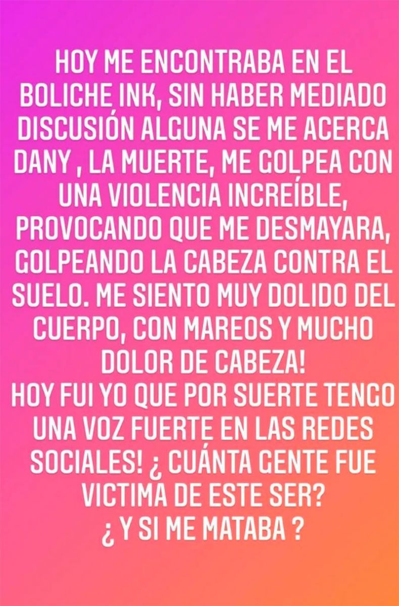 "Hoy me encontraba en el boliche Ink. Sin haber mediado discusión alguna se me acerca Dany La Muerte, me golpea con una violencia increíble provocando que me desmayara, golpeara la cabeza contra el suelo. Me siento muy dolorido del cuerpo, con mareos y dolor de cabeza! Hoy fui yo que por suerte tengo una voz fuerte en las redes sociales! ¿Cuánta gente fue víctima de este ser? ¿Y si me mataba?", agregó luego en una historia que subió a su cuenta de Instagram.
