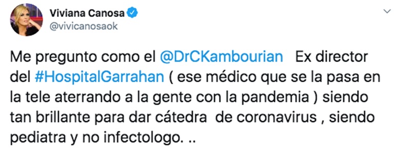 “Me pregunto cómo el doctor Kambourian, ex director del hospital Garraham, ese médico que se la pasa en la tele aterrando a la gente con la pandemia, siendo tan brillante para dar cátedra de coronavirus, siendo pediatra y no infectólogo“, disparó la periodista haciendo referencia al caso de Ricardo Russo, pediatra del hospital infantil condenado a 10 años por pedofilia.