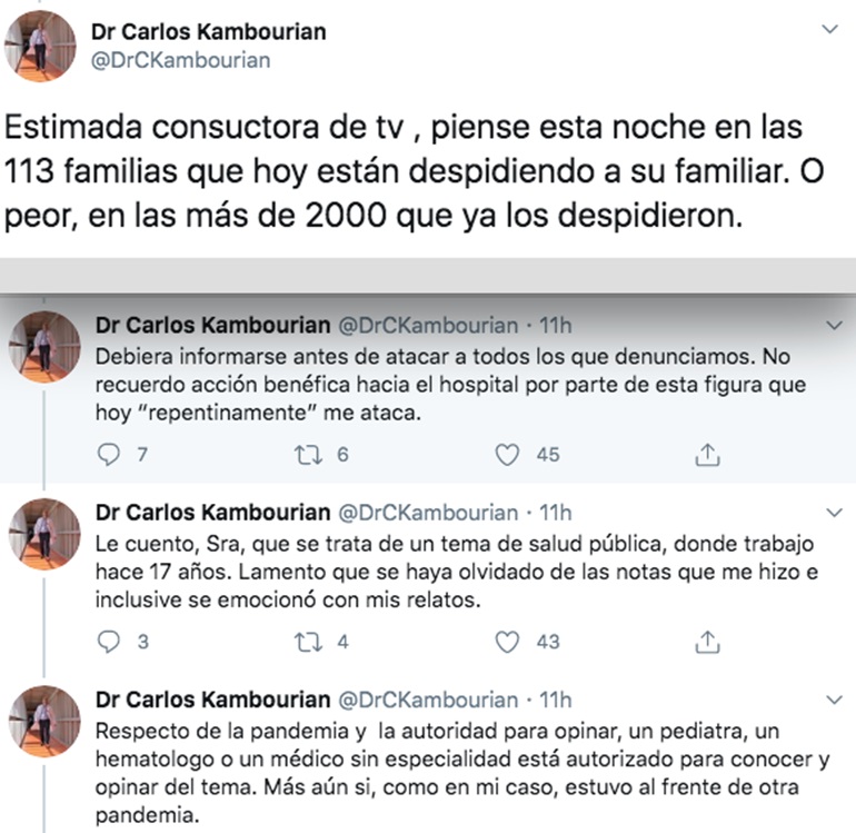 Por su parte, sin arrobarla, Kambourian escribió en su cuenta de Twitter: "Estimada conductora de tv, piense esta noche en las 113 familias que hoy están despidiendo a un familiar. O peor, en más de los 2000 que ya los despidieron. Debiera informarse antes de atacar a todos los que denunciamos. No recuerdo acción benéfica hacia el hospital por parte de esta figura que hoy repentinamente me ataca".