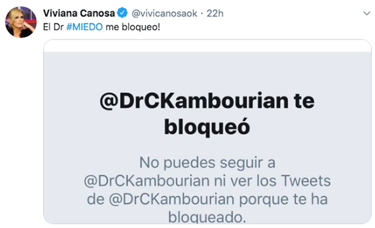 Luego de esta fuerte descargo, Kambourian decidió bloquear a Canosa y la periodista no lo dejó pasar. "El doctor miedo me acaba de bloquear“, disparó.