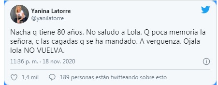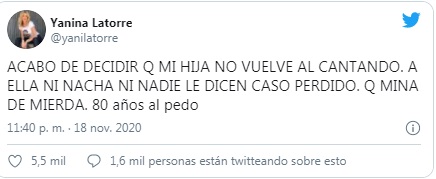 Y luego de compartir algunos tuits de personas que salieron a apoyar a su hija, la esposa de Diego Latorre tomó una drástica determinación. "ACABO DE DECIDIR Q MI HIJA NO VUELVE AL CANTANDO. A ELLA NI NACHA NI NADIE LE DICEN CASO PERDIDO. QUÉ MINA DE MIERDA. 80 años al pedo", publicó furiosa en su cuenta de Twitter. Y remató: "Qué suerte que no fui. Lola me llamo llorando desesperada. ¿Alguien hace todo tan perfecto como para ajusticiar así a una chica de 19?". Además, amenazó con exponer cuestiones relacionadas a Nacha y sus hijos.