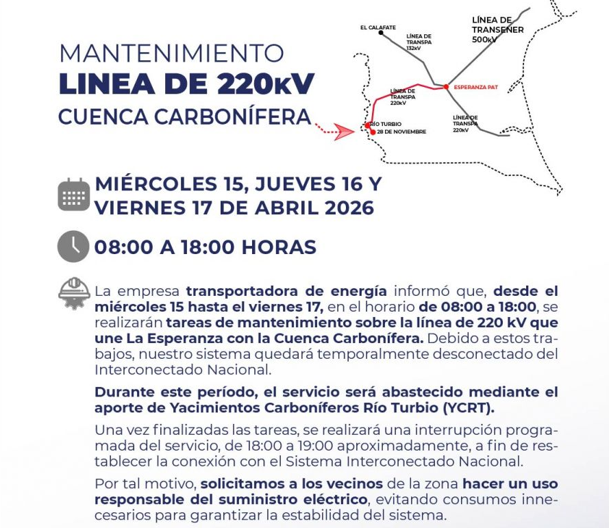 Corte programado en la Cuenca Carbonífera: anuncian tareas de mantenimiento en la red eléctrica