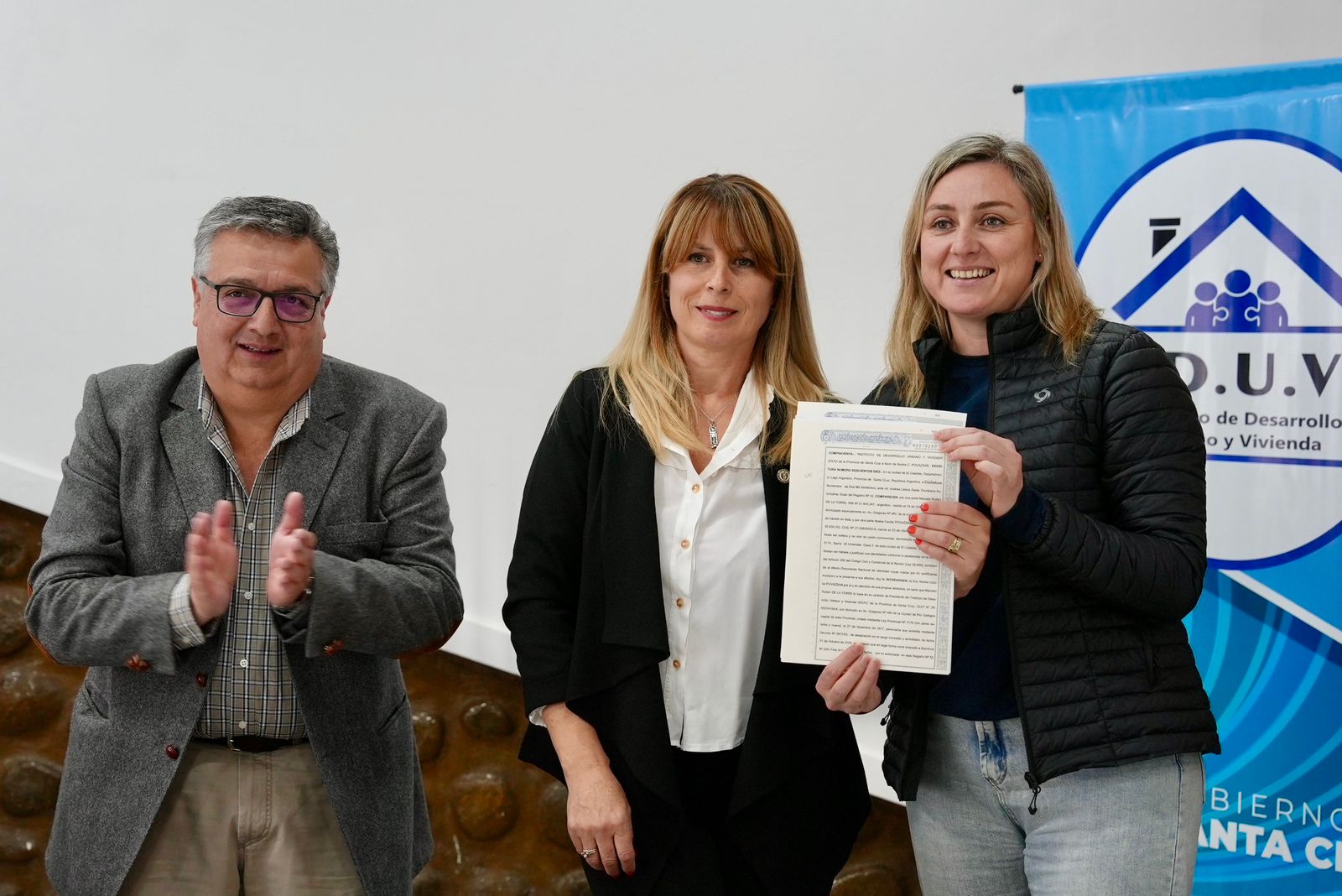 El acto, que se efectuó en el Salón de la Secretaría de Turismo, fue presidido por el presidente del IDUV, Marcelo De La Torre, acompañado por las escribanas a cargo del proceso y autoridades provinciales.