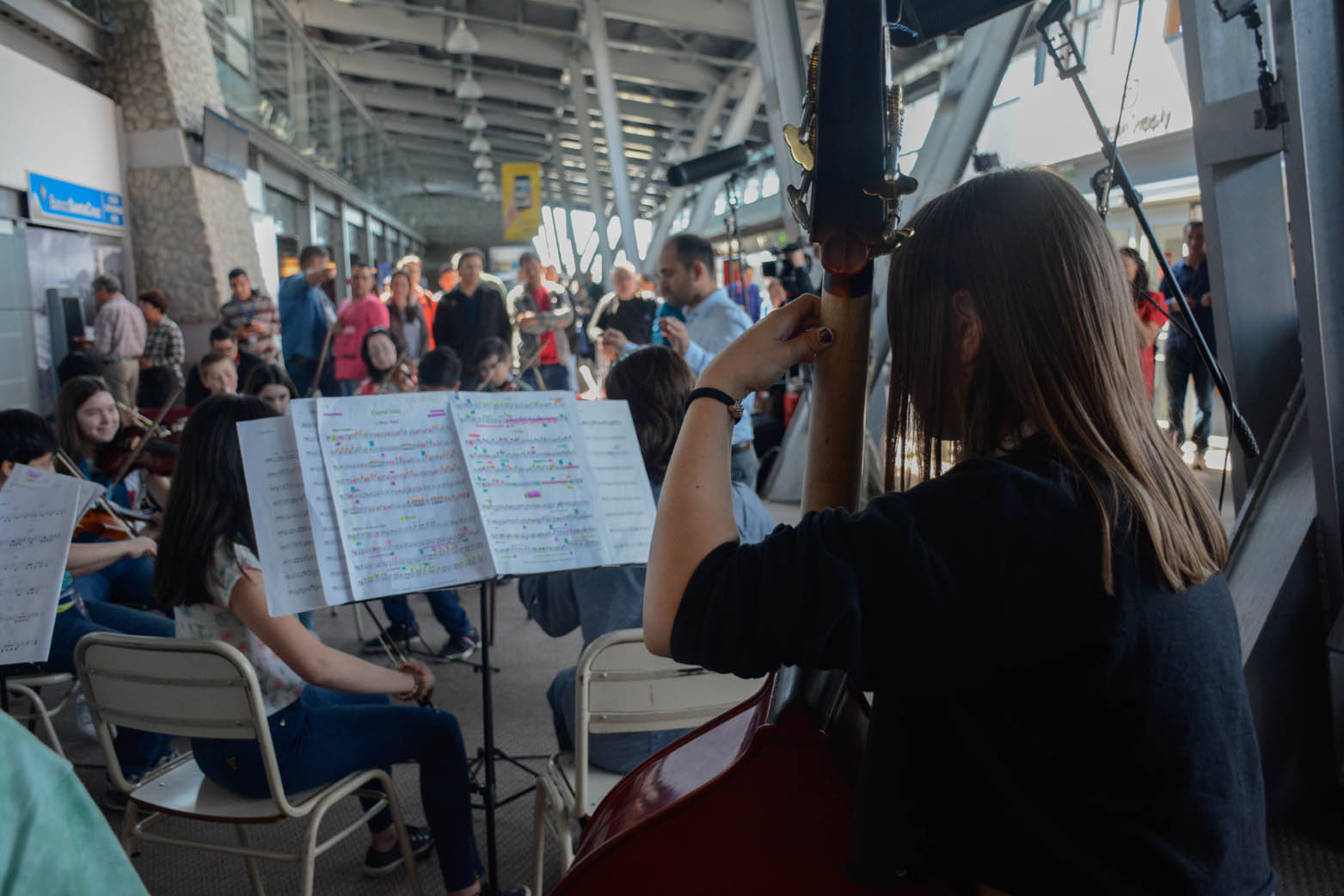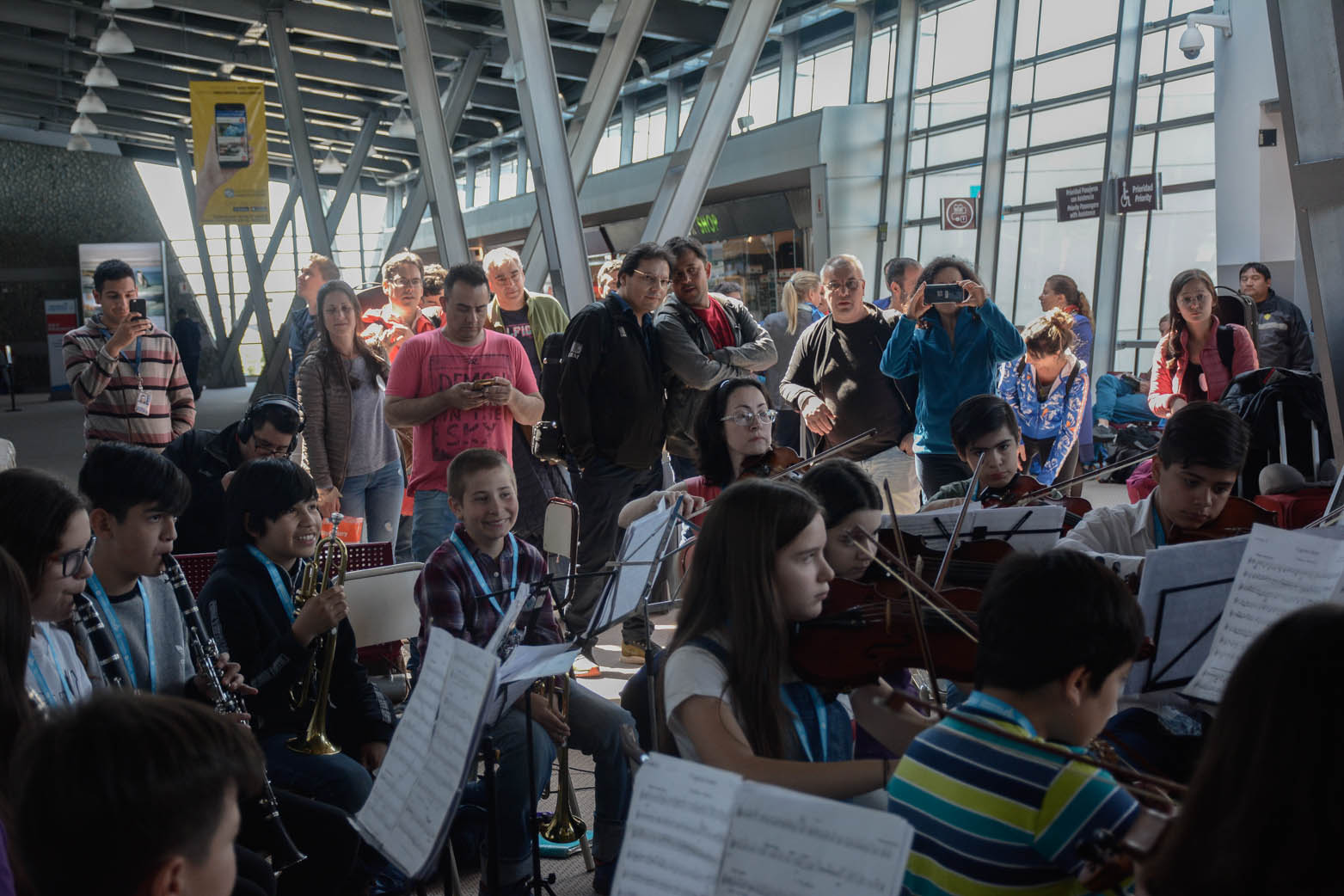 Docentes y estudiantes de la Orquesta Juvenil de El Calafate, se presentaron esta mañana en el Aeropuerto Internacional para recibir a maestros y maestras nacionales que dictarán los talleres y se presentarán en concierto junto a más de 120 estudiantes de toda la provincia, en el marco del evento organizado por el Gobierno de Santa Cruz, a través del Consejo Provincial de Educación y la Secretaria de Estado de Turismo.
