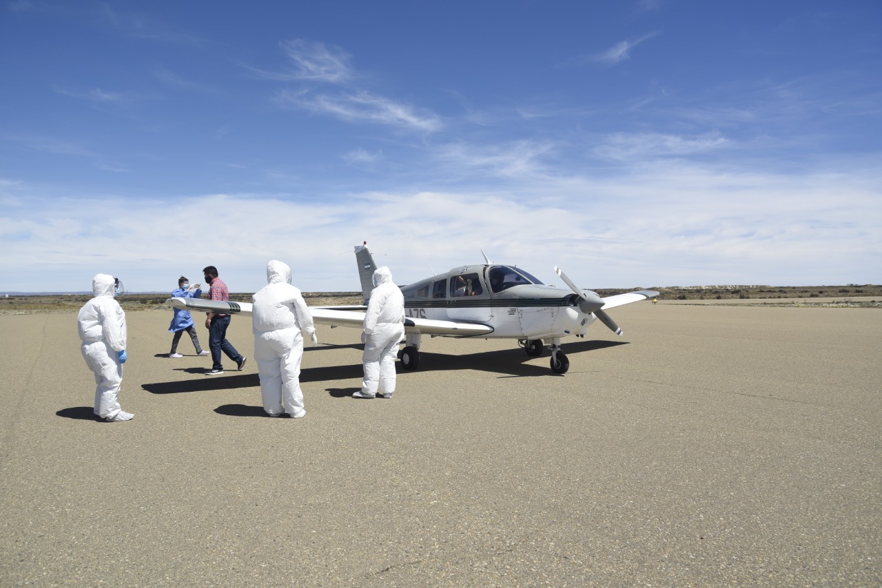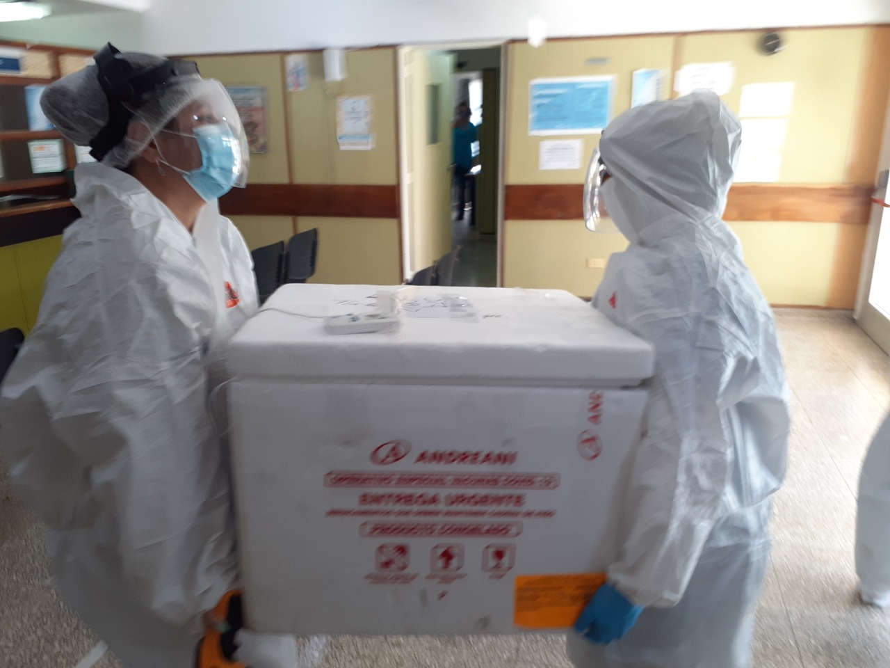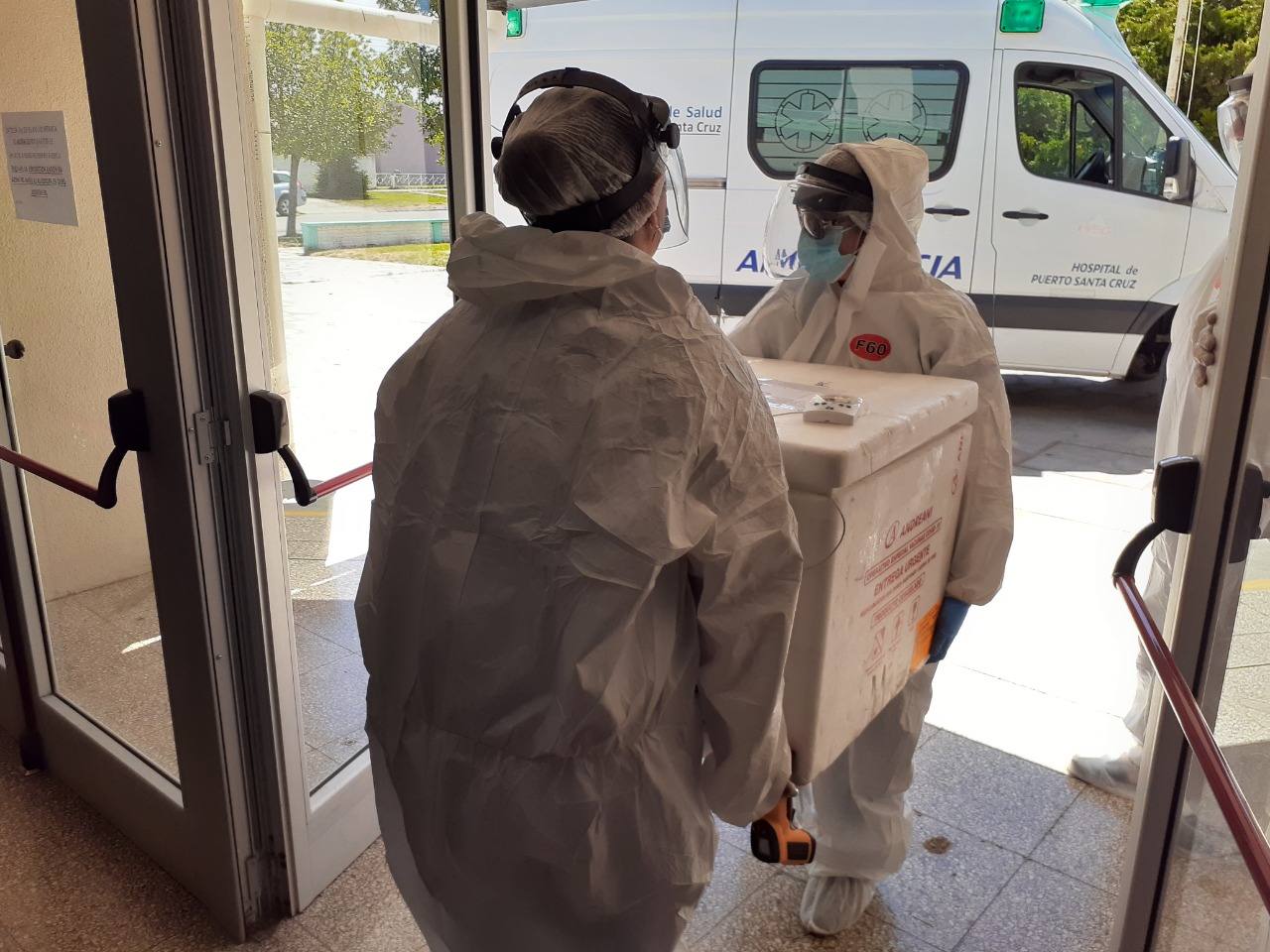 La avioneta aterrizó en el aeropuerto y según el protocolo dispuesto, personal provisto con equipamiento de protección personal movilizó la carga hasta una ambulancia y desde ahí se dirigió al hospital.