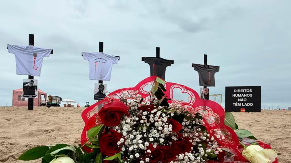 Justo en frente del Copacabana Palace, en el corazón turístico de la capital de Brasil, se montaron cruces con remeras de la Policía Civil y Militar con manchas rojas que simulan ser sangre y un cartel que dice: “Los derechos humanos no tienen lado”.