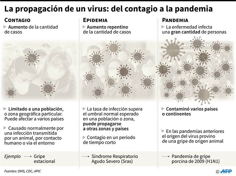 Se denomina pandemia a la propagación mundial de una nueva enfermedad. Se produce cuando surge un nuevo virus gripal que se propaga por el mundo y la mayoría de las personas no tienen inmunidad contra él. Por lo general, los virus que causaron pandemias con anterioridad provenían de virus gripales que infectan a los animales, señala el portal de la OMS.